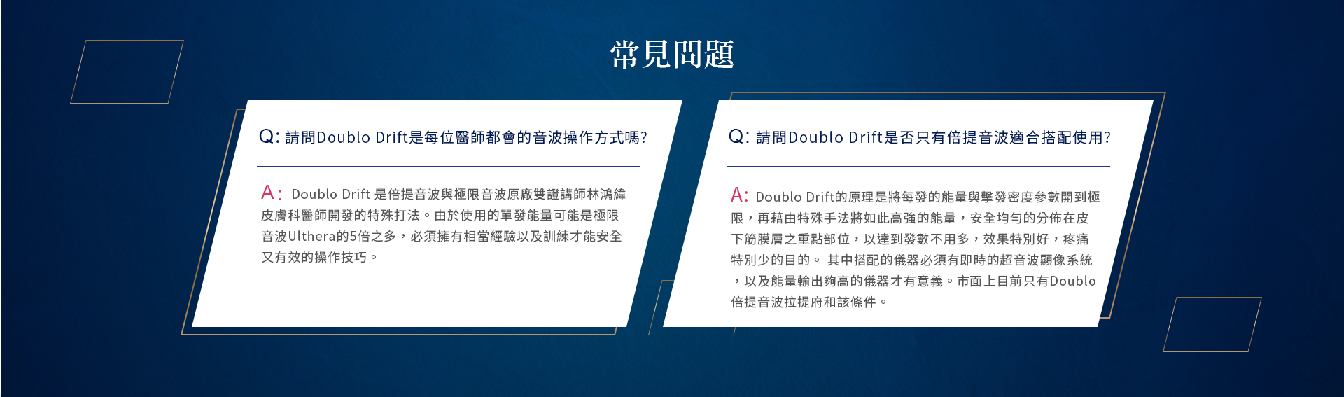 Doublo Drift 是倍提音波與極限音波原廠雙證講師林鴻緯皮膚科醫師開發的特殊打法。由於使用的單發能量可能是極限音波Ulthera的5倍之多,必須擁有相當經驗以及訓練才能安全又有效的操作技巧。